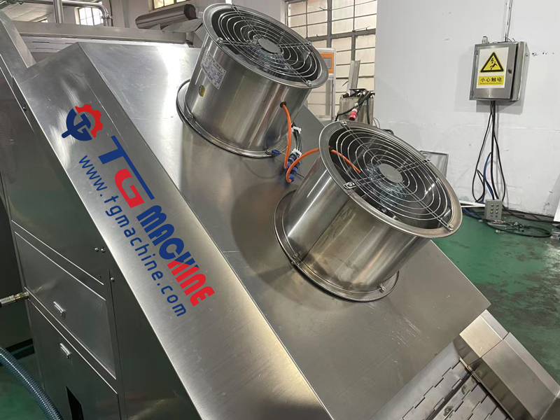 Konveyör, patlamış mısırı döner eleme soğutucusuna taşır ve birincil soğutma aşaması olarak görev yapar.